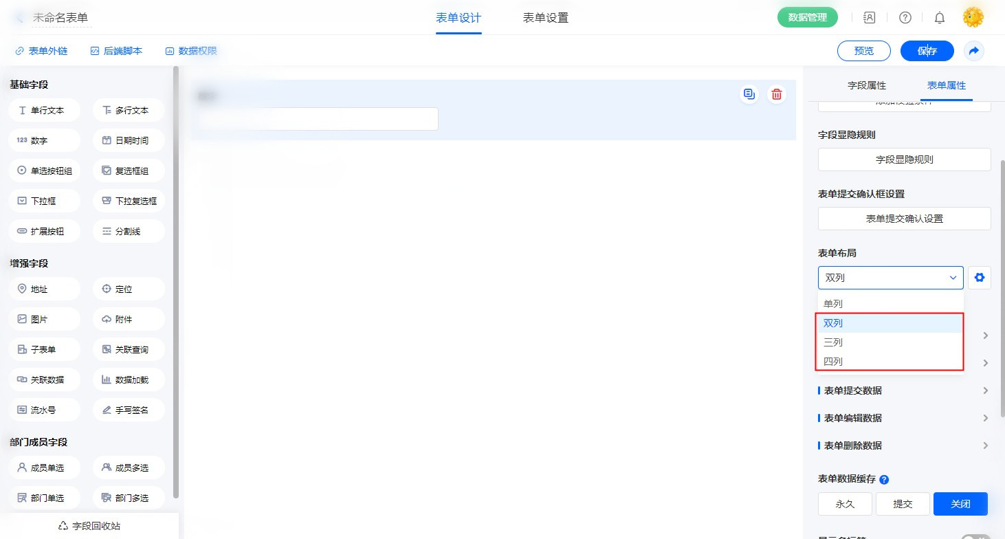 1、开启“表单属性”——“电脑端表单布局”,开启“多列”
