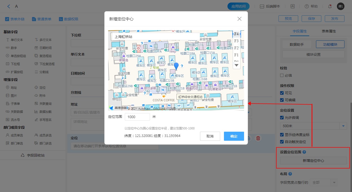 设置定位中心和定位范围,则定位时,处于以定位中心为圆心、以定位范围为半径之内的地点,才能通过校验进行提交,否则会提示超出规定范围。