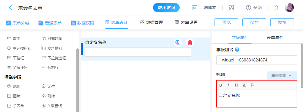 “字段别名”用于后端开发,默认为系统自动生成的随机字符串,可修改。