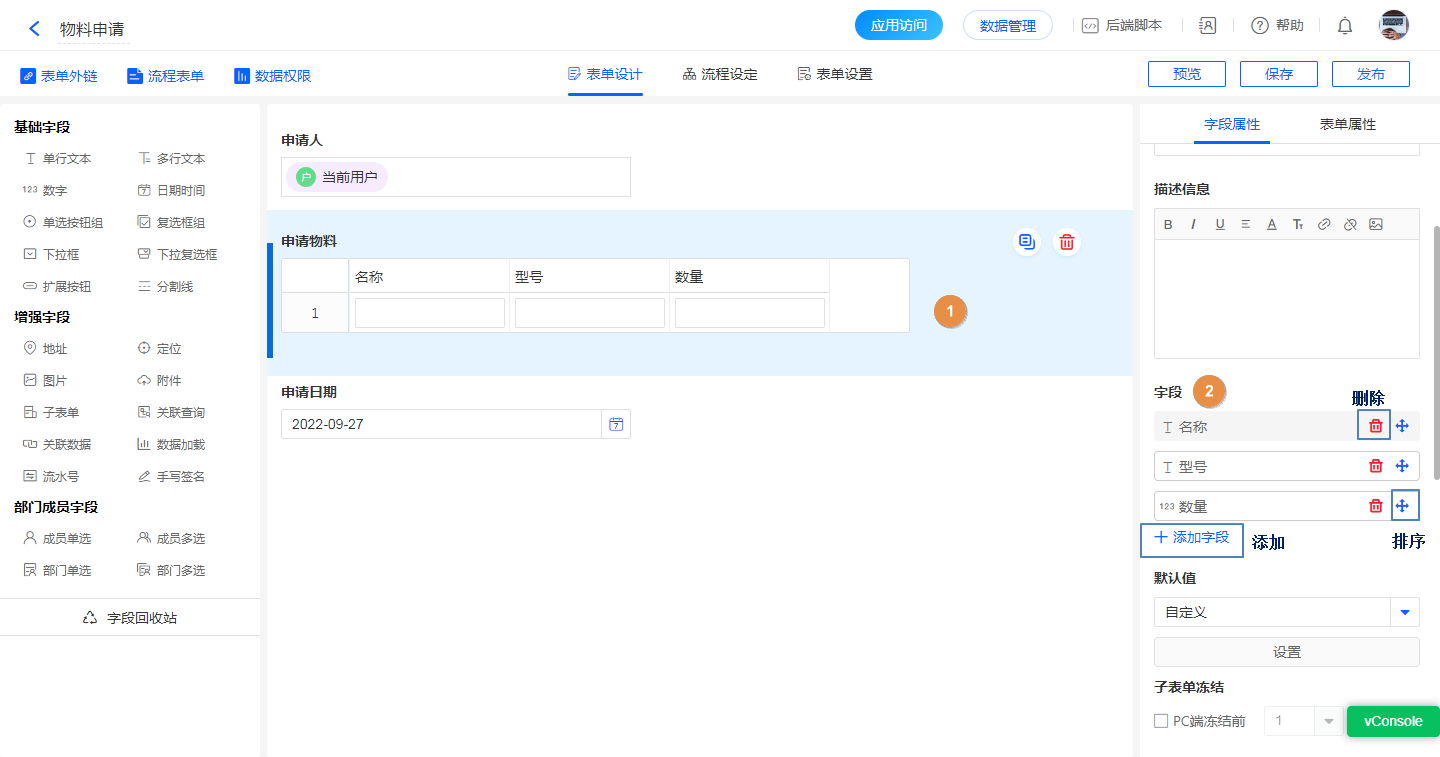 方式一:在「子表单 >> 字段属性 >> 子字段」处会显示已经添加的子字段,点击对应的排序、删除、添加按钮即可进行对应的子字段操作: