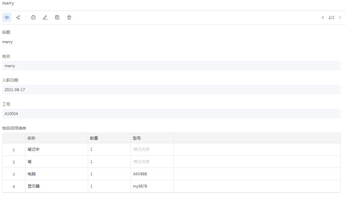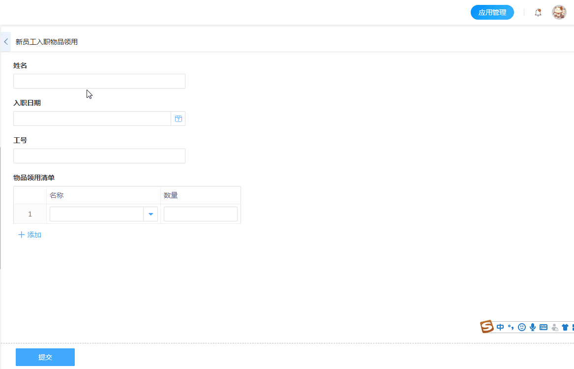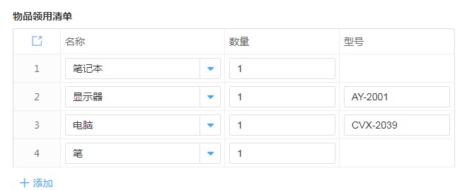 创建【新员工入职物品领用】表单,添加【姓名】、【入职日期】、【工号】等普通字段;添加【物品领用清单】子表单字段,包含【名称】、【数量】、【型号】等字段。