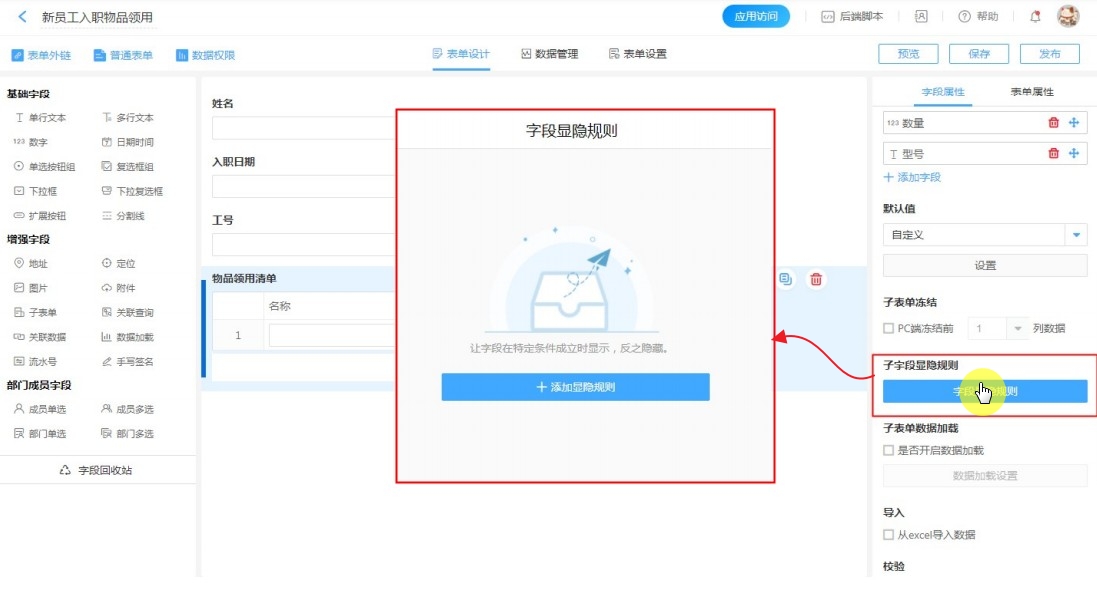 选中子表单【物品领用清单】,点击字段属性>>添加显隐规则。