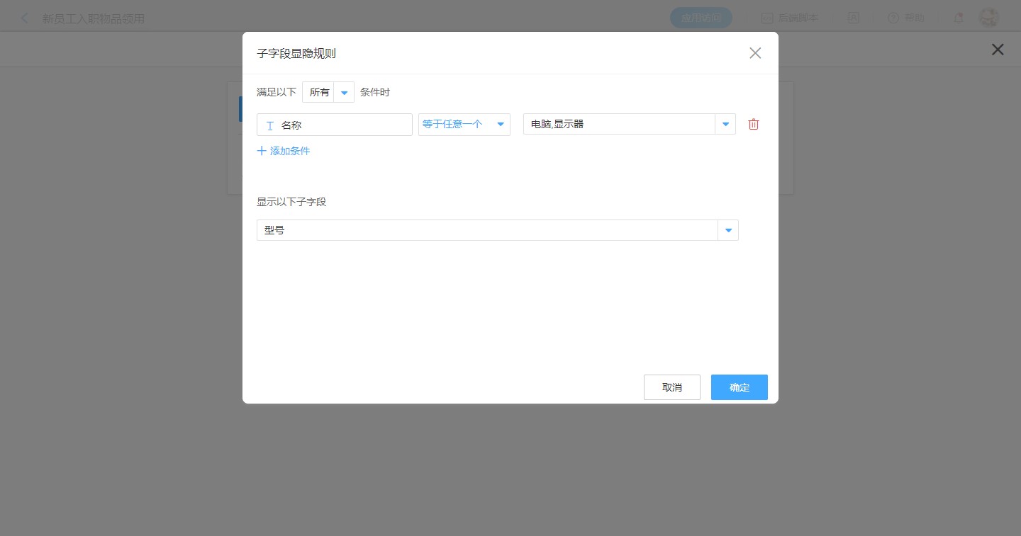 点击【添加显隐规则】,设置显示条件为:满足【所有】条件时,【名称】等于【电脑】或【显示器】时,显示【型号】,如下图所示: