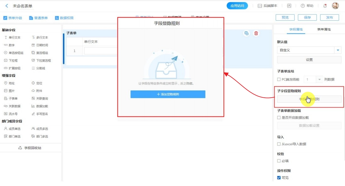 表单设计-子表单-字段属性-字段显隐规则。