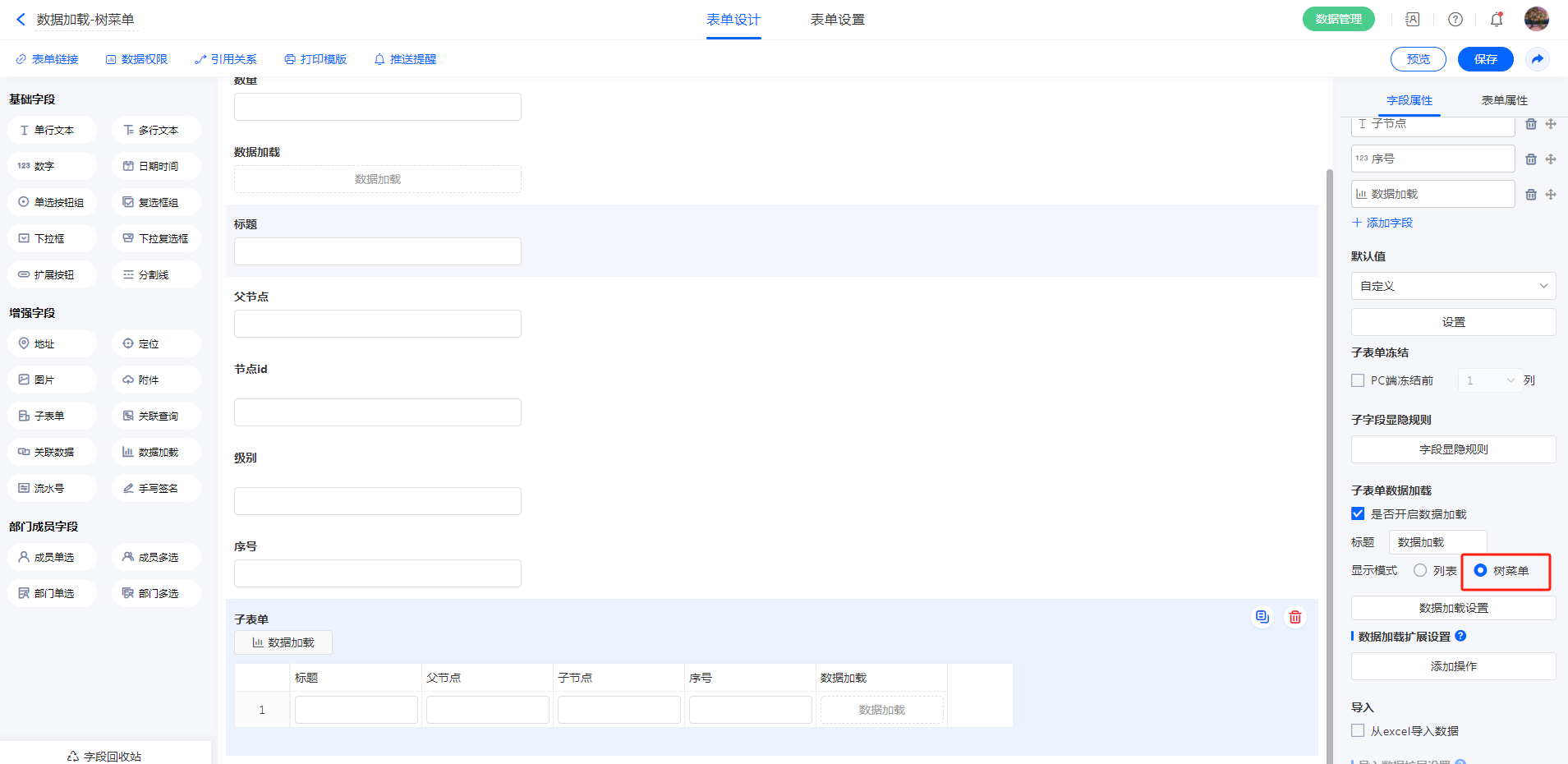 点击子表单的数据加载设置显示模式为【树菜单】即可设置子表单数据加载的数据源,并可进行具体的设置。