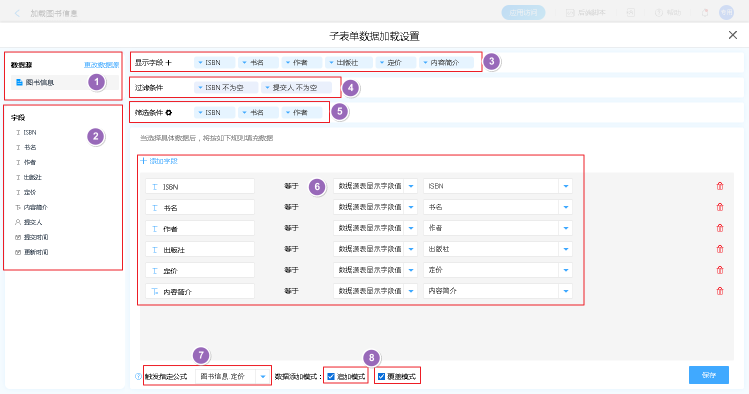 • 追加模式: 在当前子表单已有数据的基础上追加新的数据。
