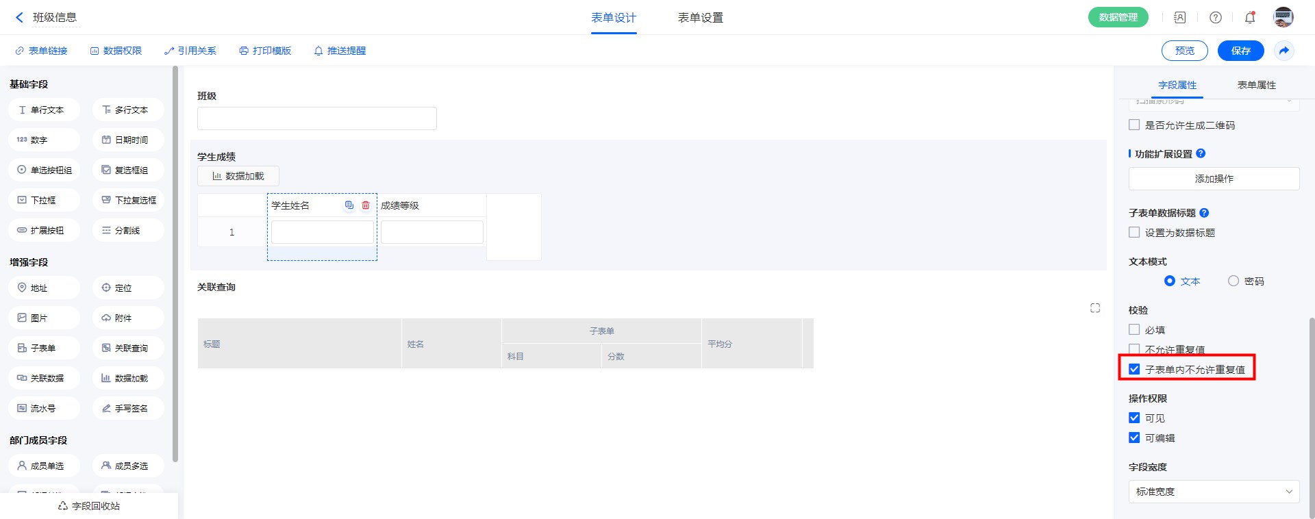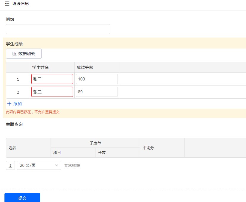 子字段的 【子表单内不允许重复值】 校验:勾选后,当条数据下的子表单记录中,该字段不允许重复。