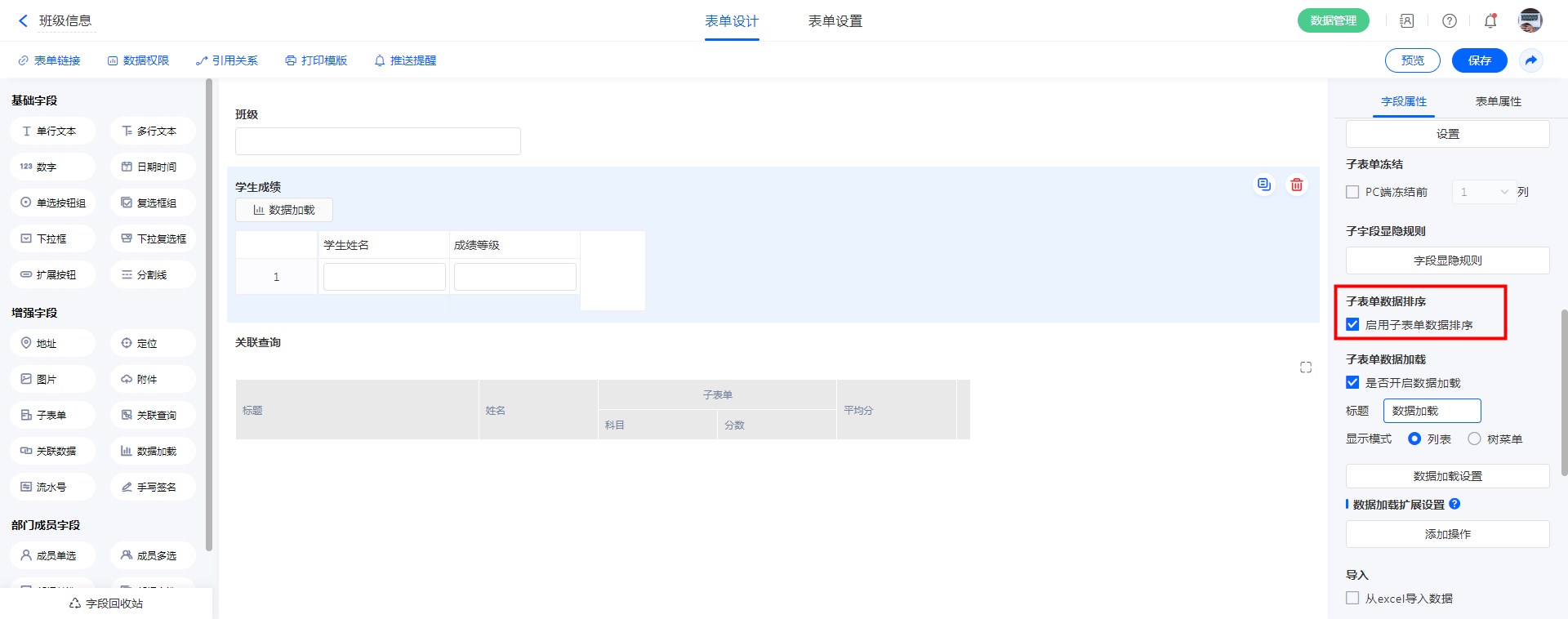 支持子表单内的字段添加、删除、排序。