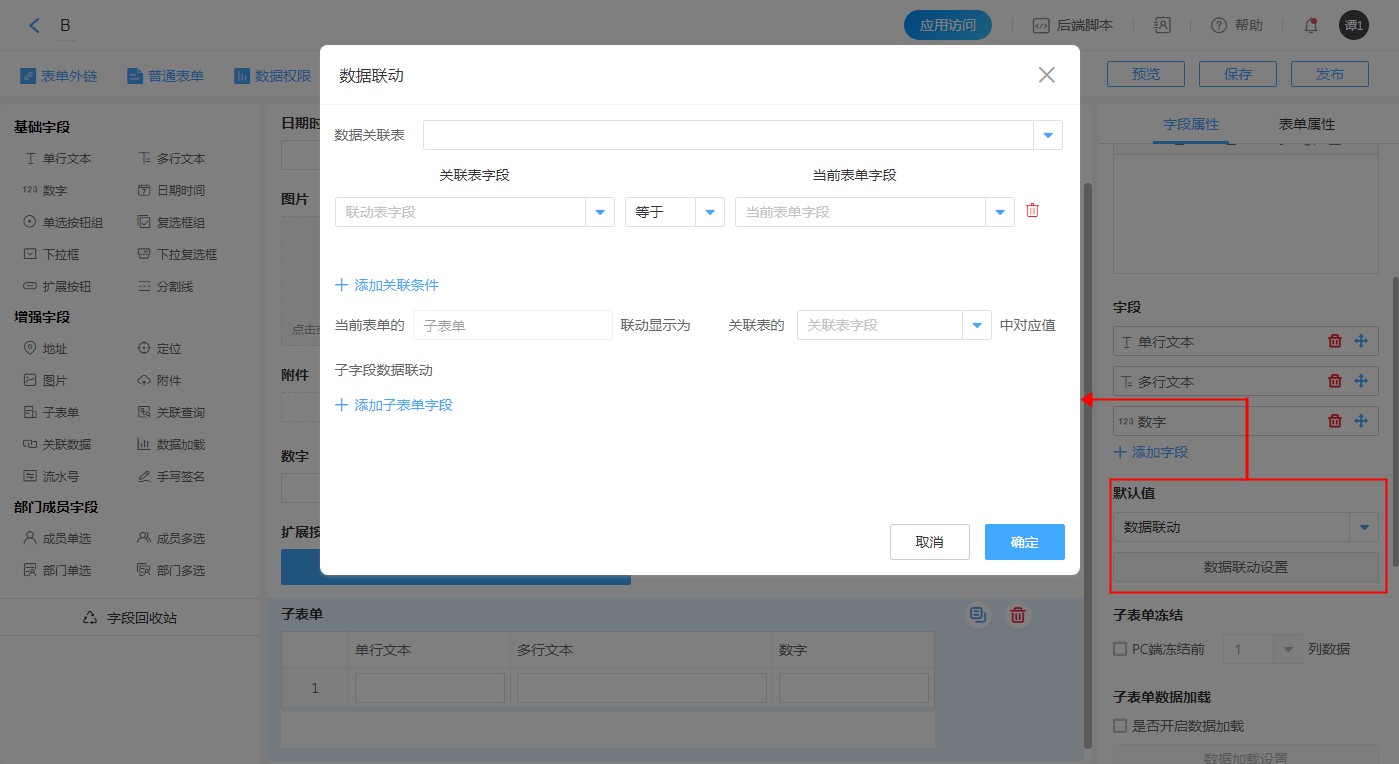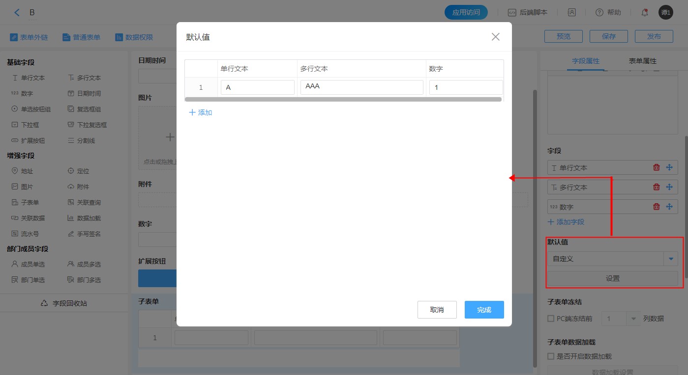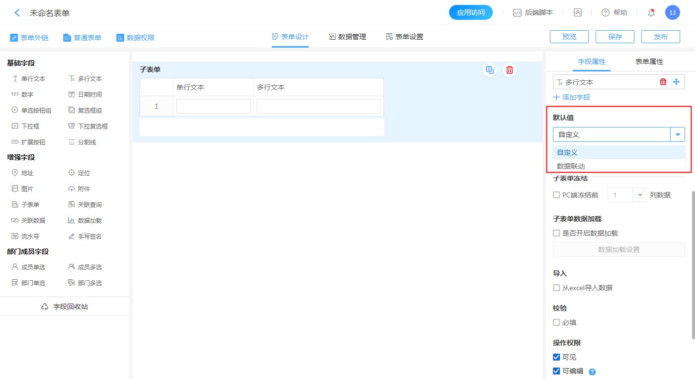 - 自定义:子表单内的字段在打开时自动显示设定的值。