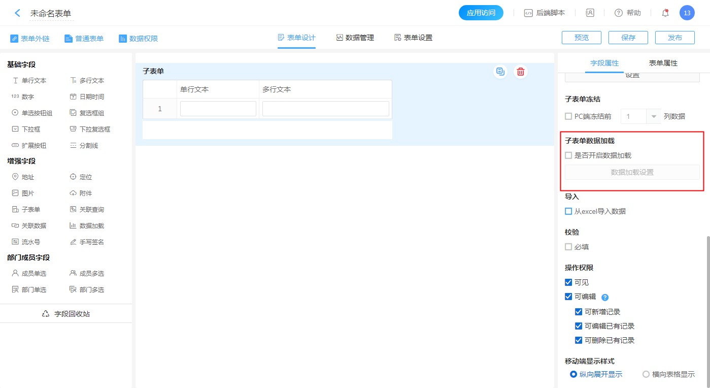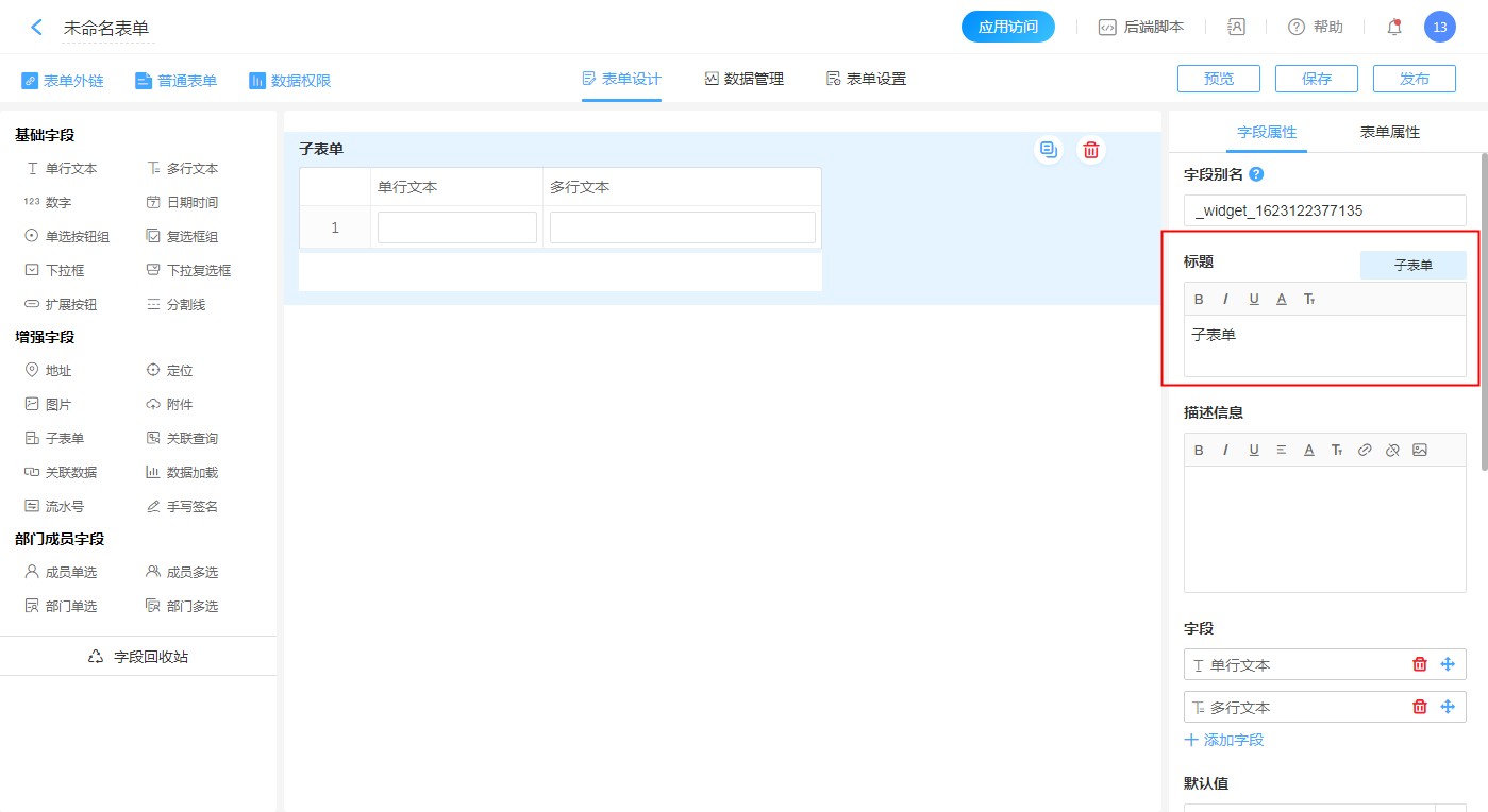 - 子表单内字段的控件属性设置,与普通字段一样,设置后记得保存。