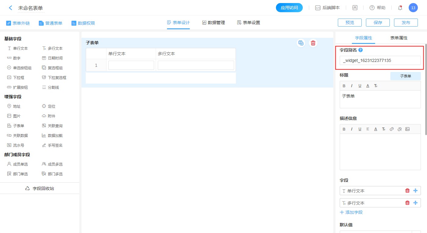 - 字段别名同一表单下唯一。