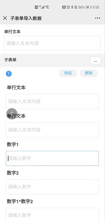 子表单支持从Excel直接导入数据到子表单中,勾选本选项后当前子表单可通过Excel导入的方式填入数据。