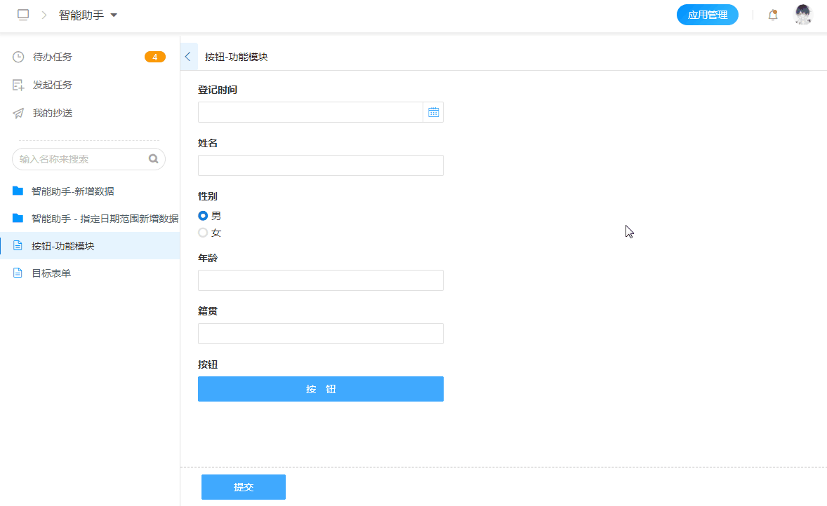功能插件是扩展按钮基本功能之一,设置扩展按钮的属性为功能插件,并对引用的插件进行设置,在点击扩展按钮后,会按顺序执行所设定的功能插件,为表单的扩展性提供无限支持。
