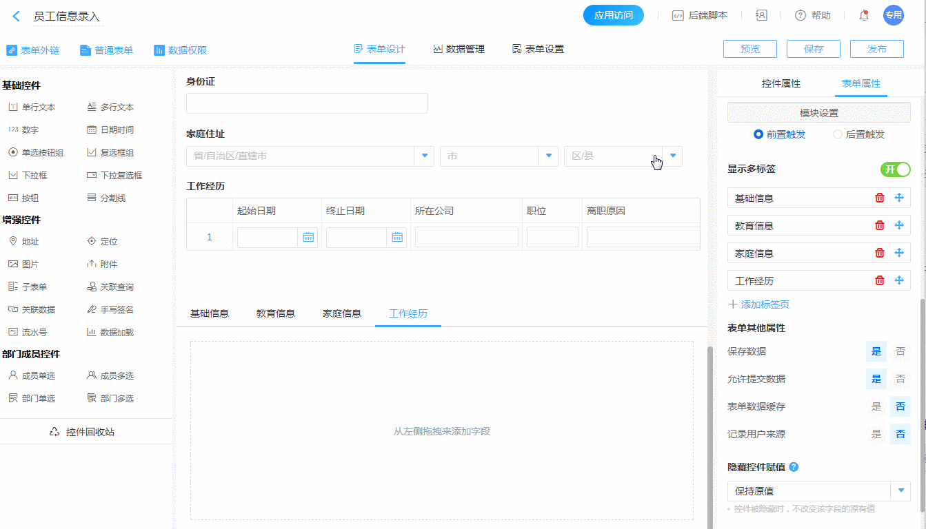 例如:新员工入职表单当中,分别需要登记员工的家庭信息、教育情况、工作经历、婚育情况等等。