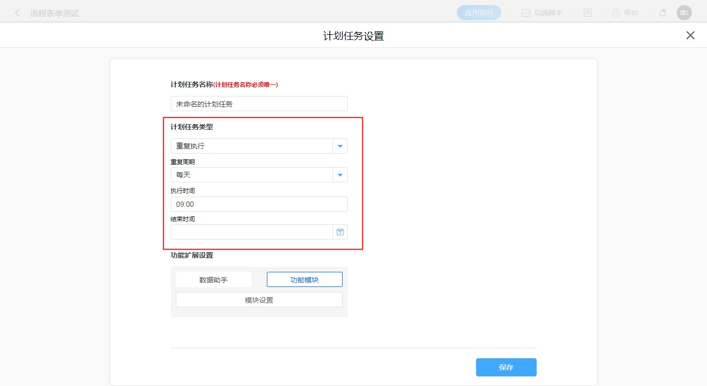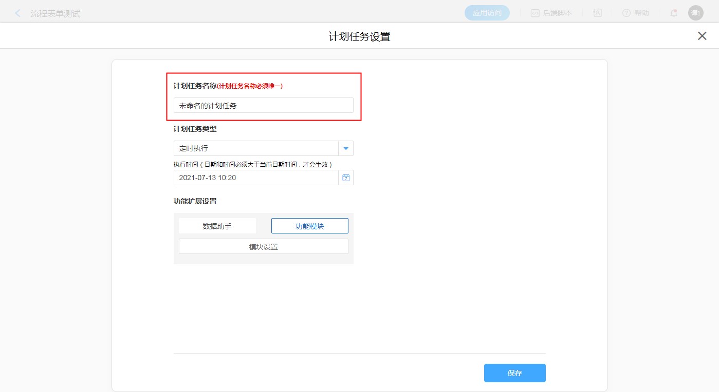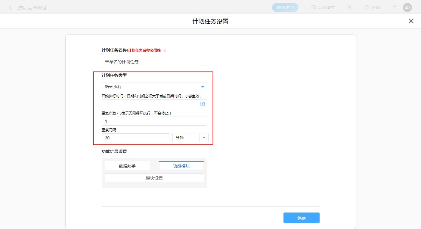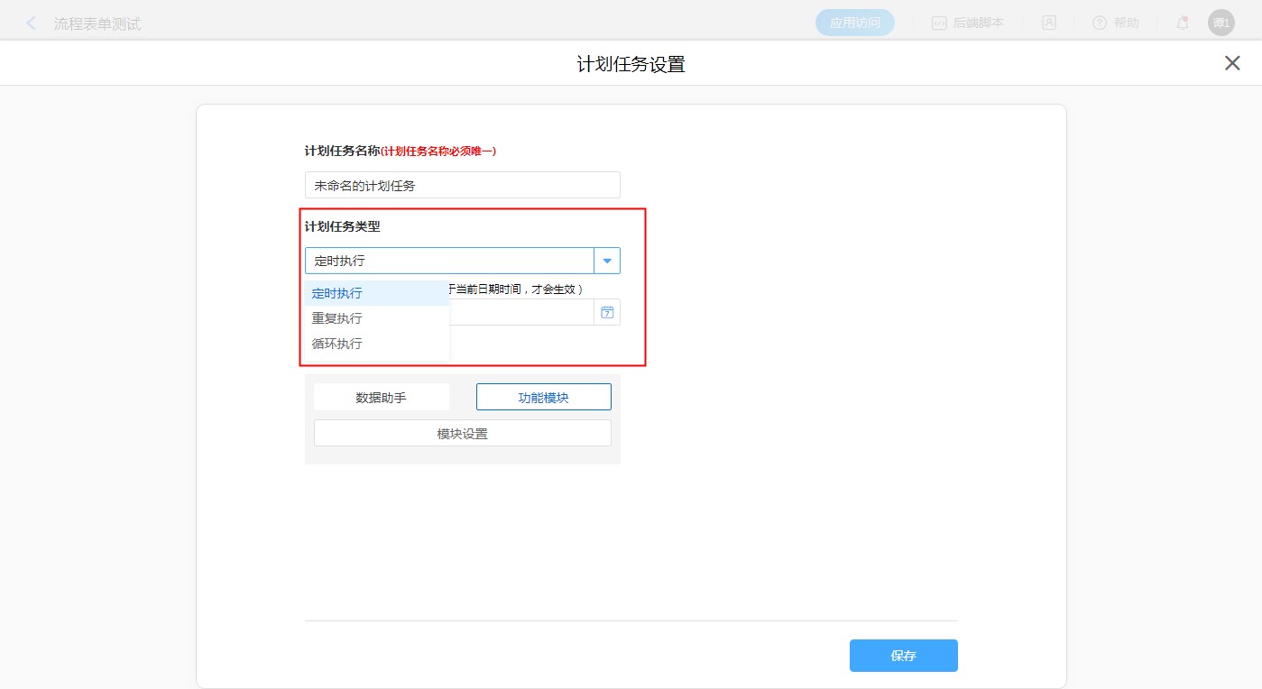 步骤:【应用编辑页面选择目标表单】——【表单设置】——【计划任务】——【新建计划任务】