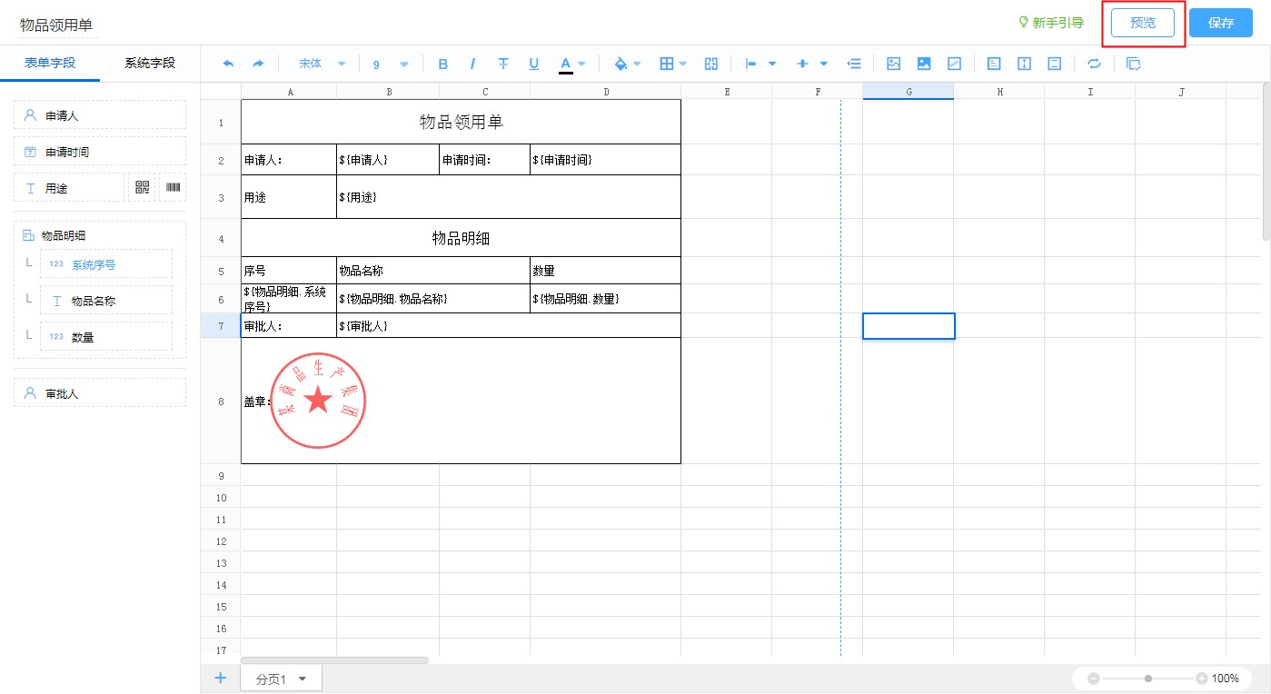 • 设计完成后,点击【预览】按钮,预览打印效果。