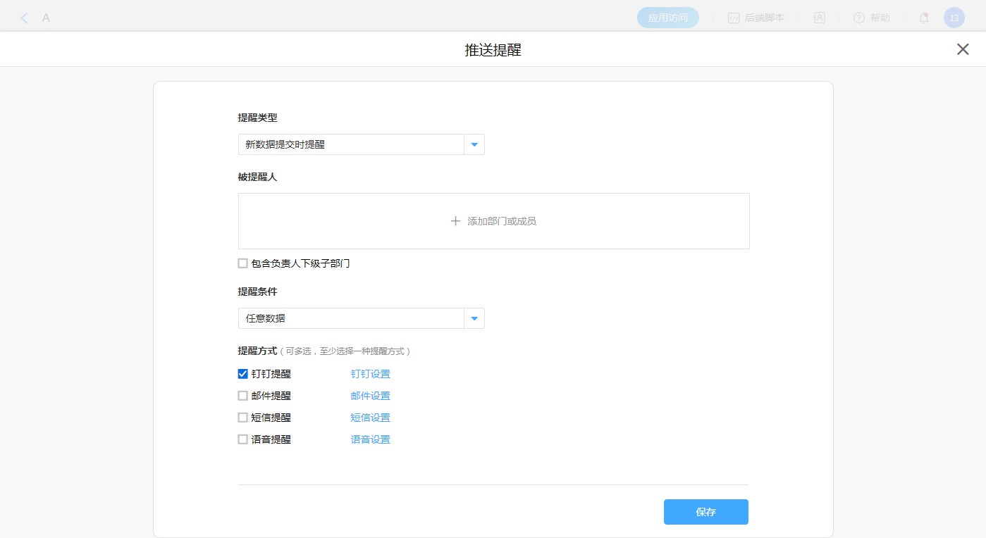 步骤:设置步骤:【表单设置】——【推送提醒】——【新建推送提醒】——【提醒类型】——【新数据提交时提醒】
