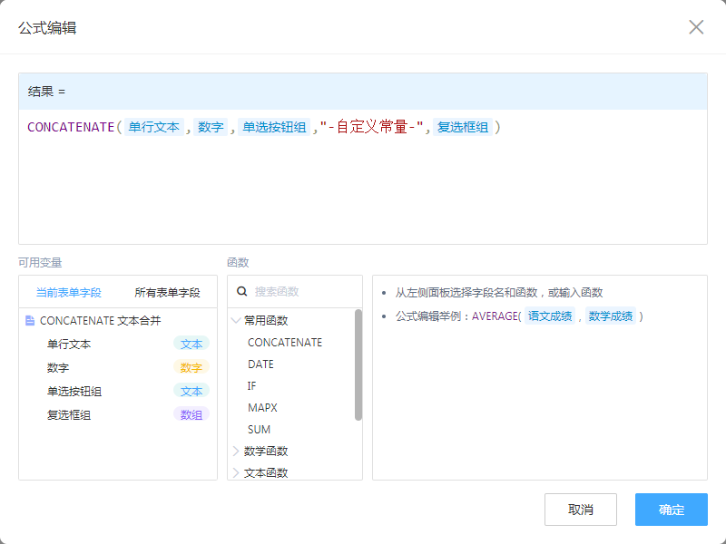 • 合并:单行文本、数字、单选按钮组、自定义常量、复选框组