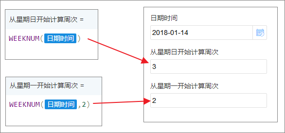 return_type(可选) 整型 设定计算周数从星期几开始。(不填默认值为1,在数据助手和数据视图中类型必填)