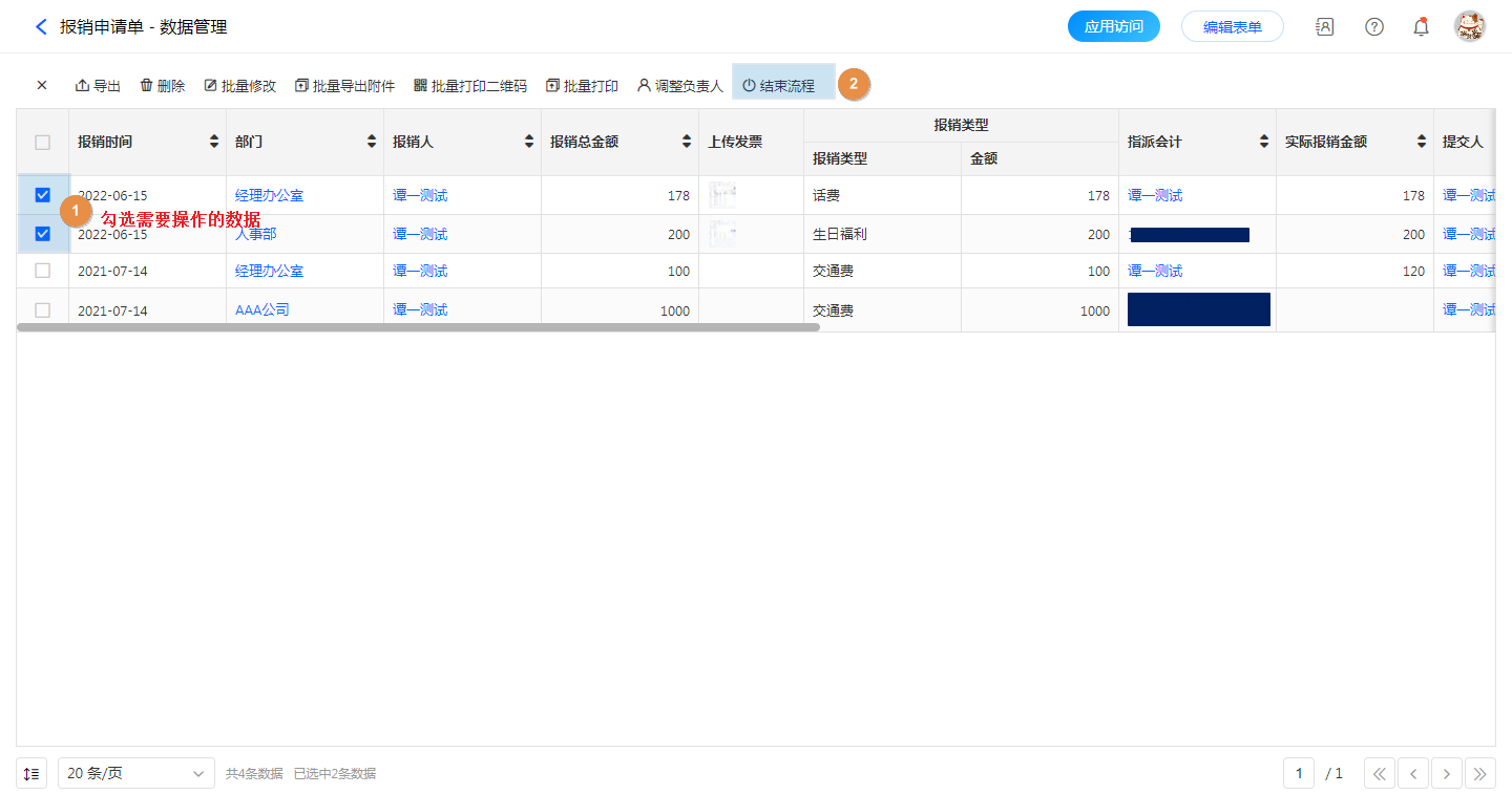 管理员登录,【应用访问】——【数据管理】——【勾选需要结束流程的数据】——【结束流程】