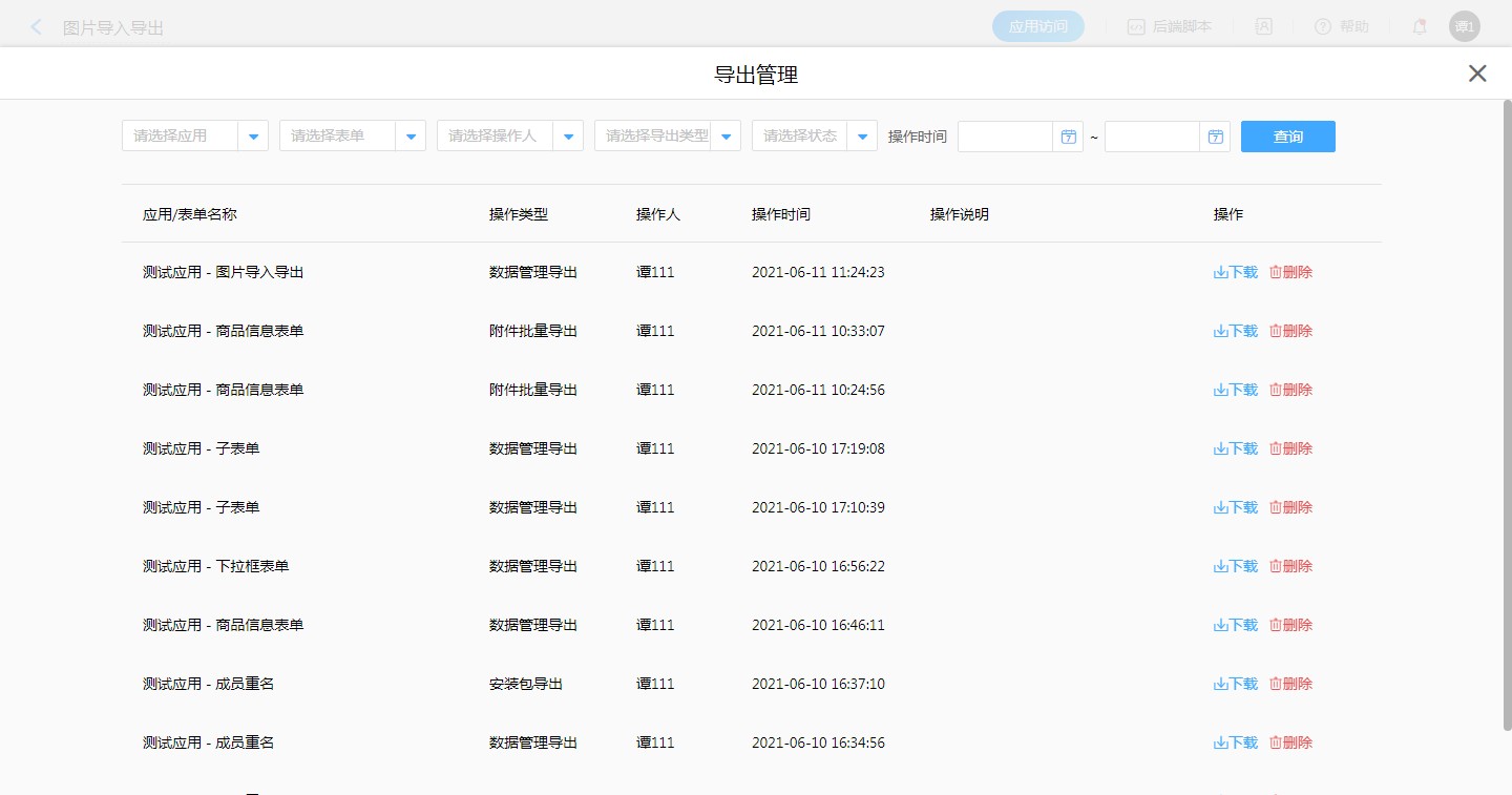 导出管理里可以查询当前账号下各应用各表单的数据导出记录,可下载或删除导出记录,过期记录也可查询。