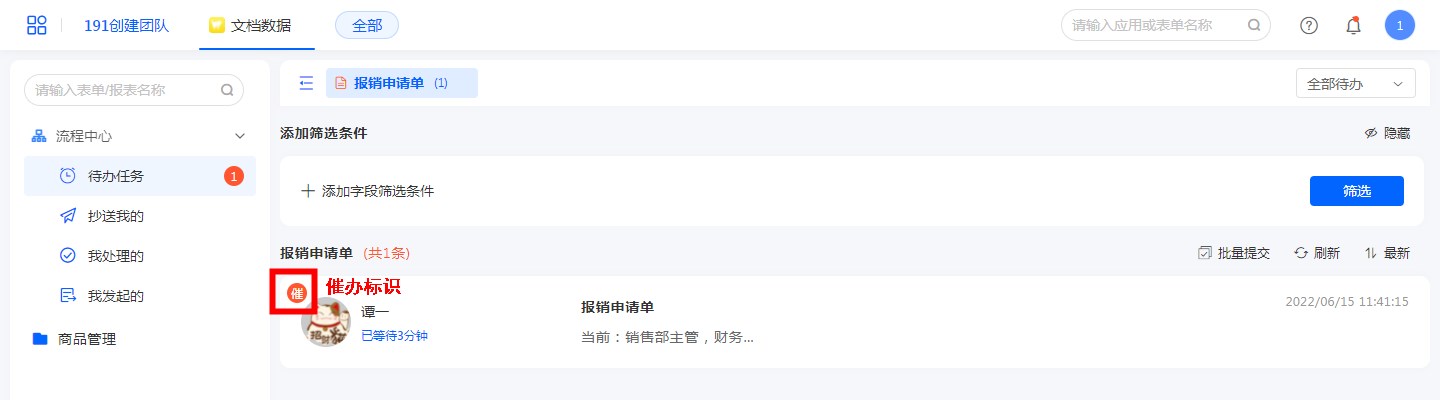 流程节点负责人收到催办消息,并在我的待办下,发现流程有催办标识。