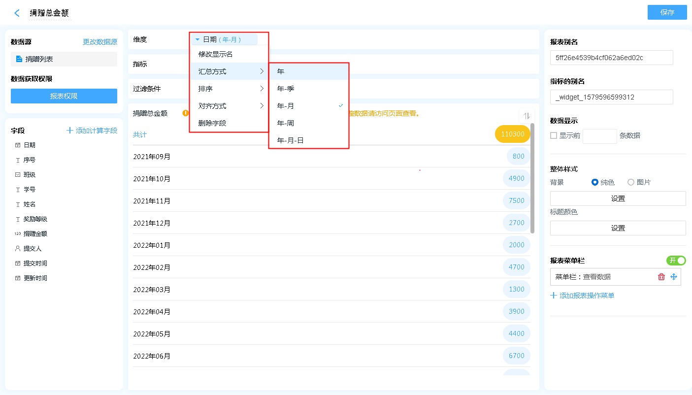 • 汇总方式: 仅日期时间字段可设置,可以设置按照何种日期格式对数据进行汇总(如:按年、按季度、按月汇总)