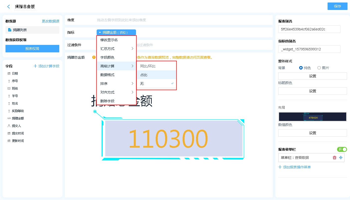 • 高级计算:高级计算可进行同环比、占比的计算,详见同环比和占比。
