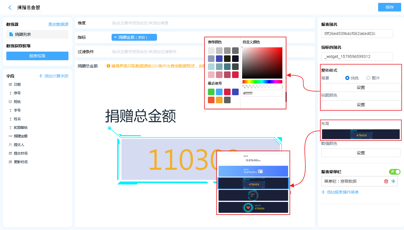 • 字段颜色: 设置当指标的数值按照指定颜色进行显示。