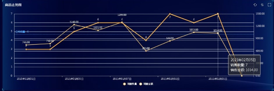 双轴图,适合将相同维度不同指标的内容拿来进行比较分析,如:运营分析系统中,商品销售详情报表中就利用双轴图的功能,将销售数量和销售金额进行同步分析,准确的分析出具体的单日销售额和销售量的比较数据。