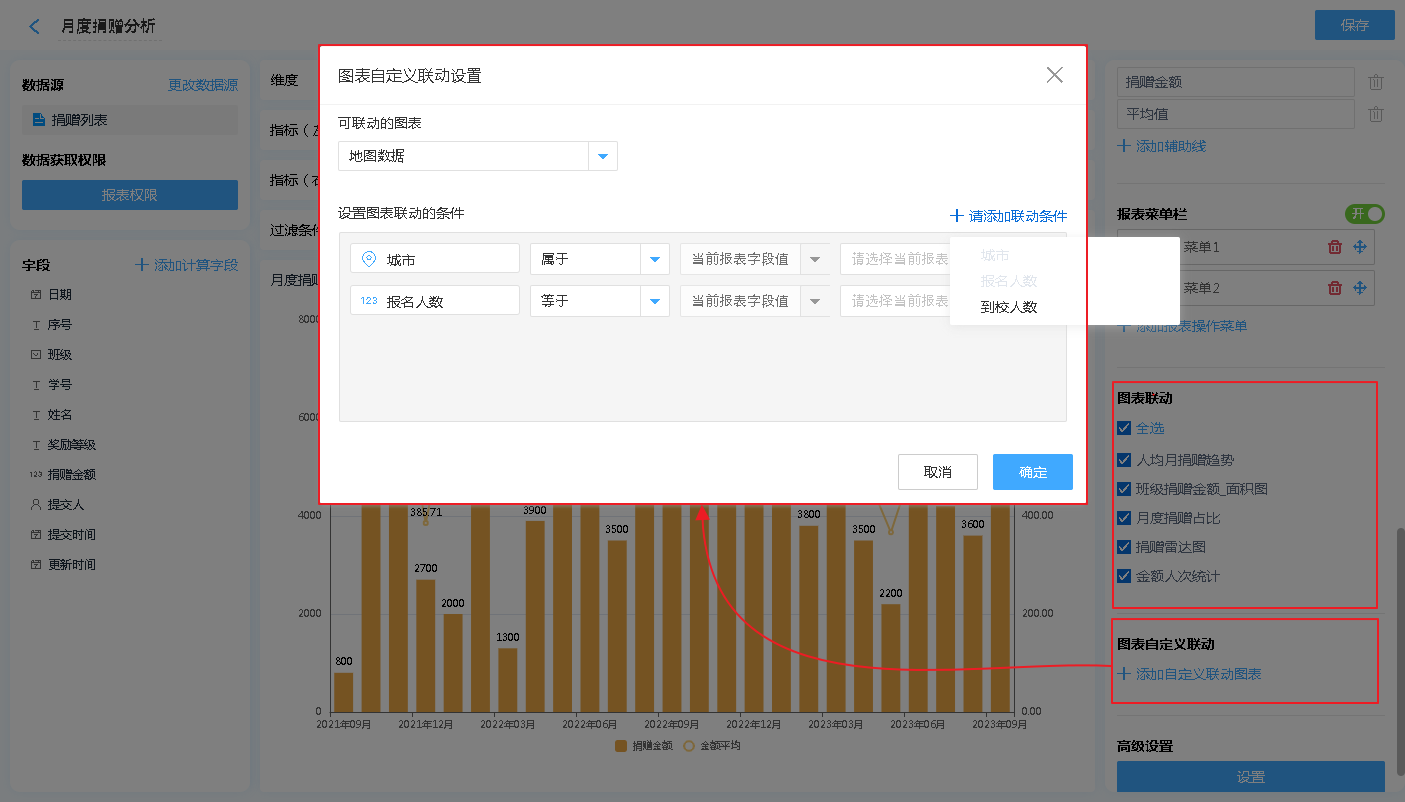 在图表联动的基础上,图表还支持自定义联动,图表自定义联动即可设置不同数据源的图表进行联动。