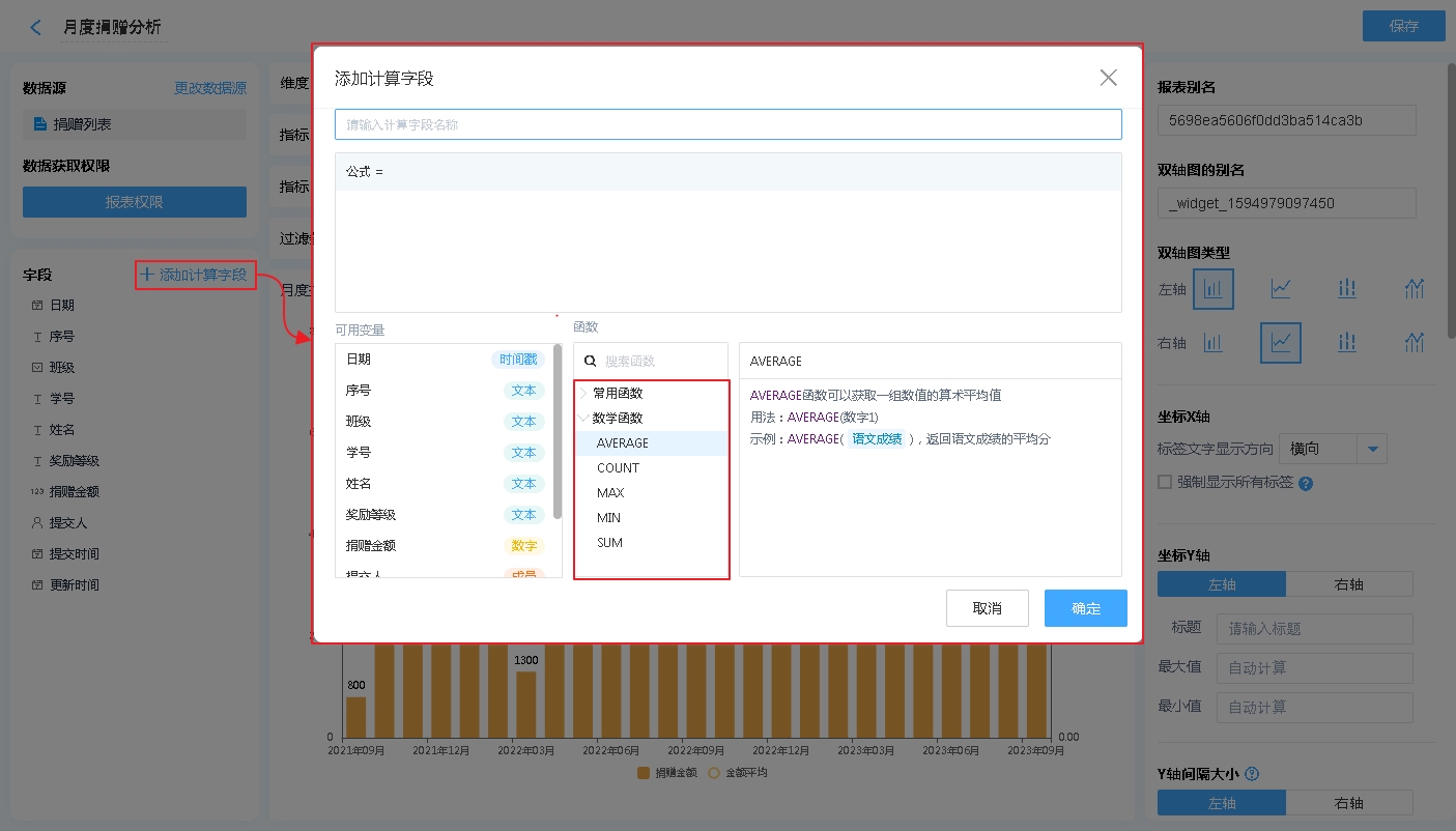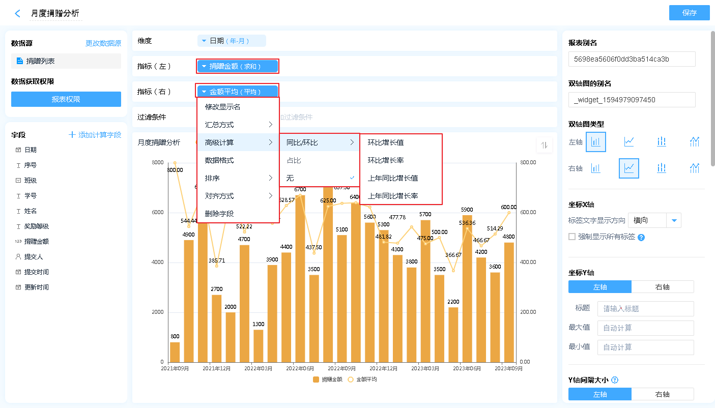 显示名称: 字段添加进入显示字段区域后,可自行修改其在双轴图中的表头文字汇总方式: 指标的汇总方式仅支持数字字段,非数字字段在拖入指标中,汇总方式只有计数一项。高级计算:高级计算可进行同环比、占比的计算,详见同环比和占比。数据格式:可通过数据格式的设计,在报表中显示自己想要的格式,详见数据格式详解。排序:支持按照指定的格式对双轴图内的数据进行排序[默认为数据创建时间]对齐方式:支持报表单元格文字的排列方式删除字段:此处的删除字段,是指从指标中删除,删除后仍可重新添加,不会对原表造成任何影响。