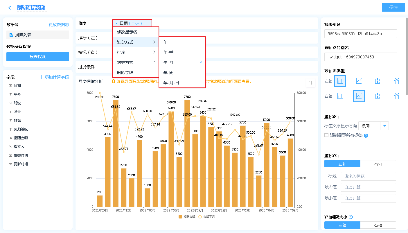 显示名称: 字段添加进入显示字段区域后,可自行修改其在双轴图中的表头文字汇总方式: 仅日期时间字段可设置,可以设置按照何种日期格式对数据进行汇总(如:按年、按季度、按月汇总)排序:支持按照指定的格式对双轴图内的数据进行排序[默认为数据创建时间]对齐方式:支持报表的排列方式删除字段:此处的删除字段,是指从显示字段中删除,删除后仍可重新添加,不会对原表造成任何影响。