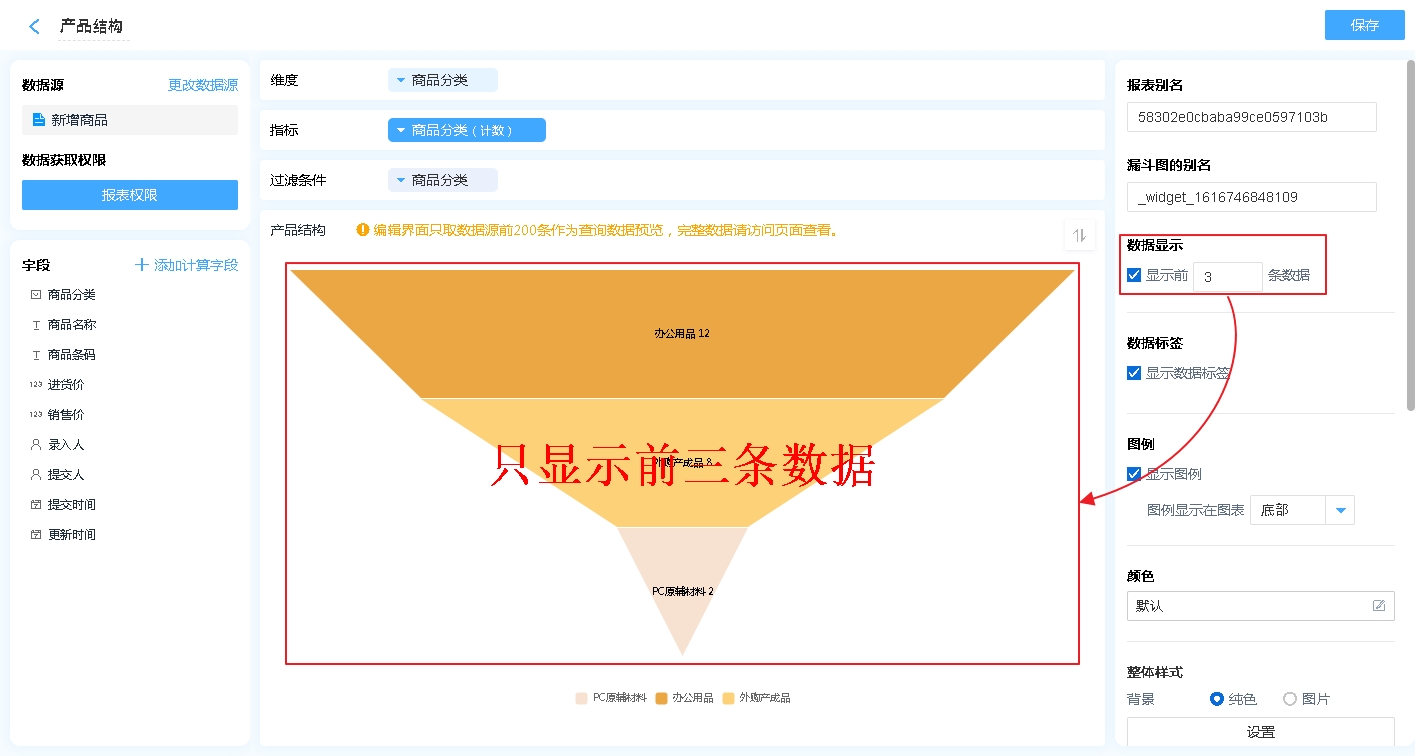 可以设置当前条形图显示数据条数,如:可以设置仅显示前3条数据等。