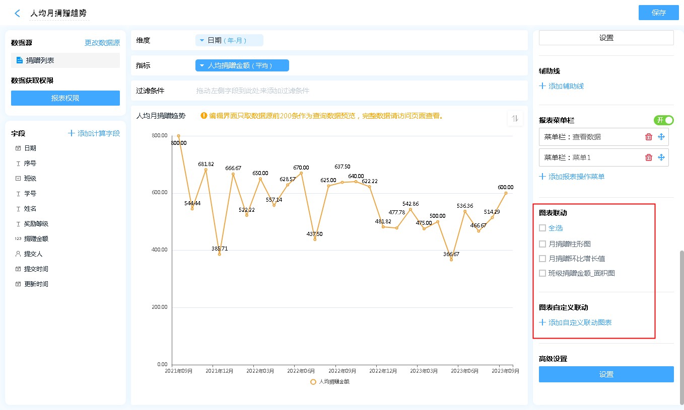 折线图支持和其他表单联动,联动目标支持同数据源的任何报表。主联动表中选择某个字段或某个数据,被联动表中会出现与之相应的数据。