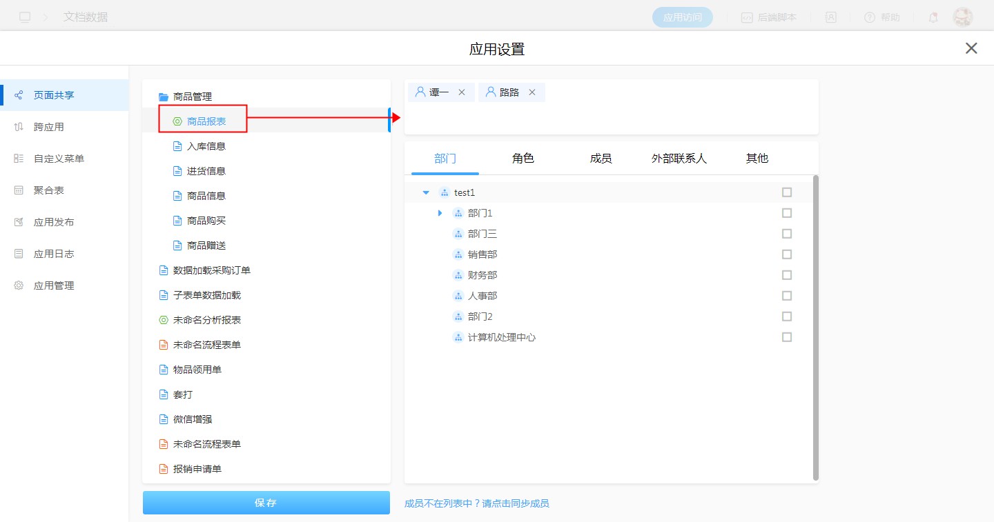 【应用管理】-【页面设置】-【页面共享】,选中报表分享给成员。