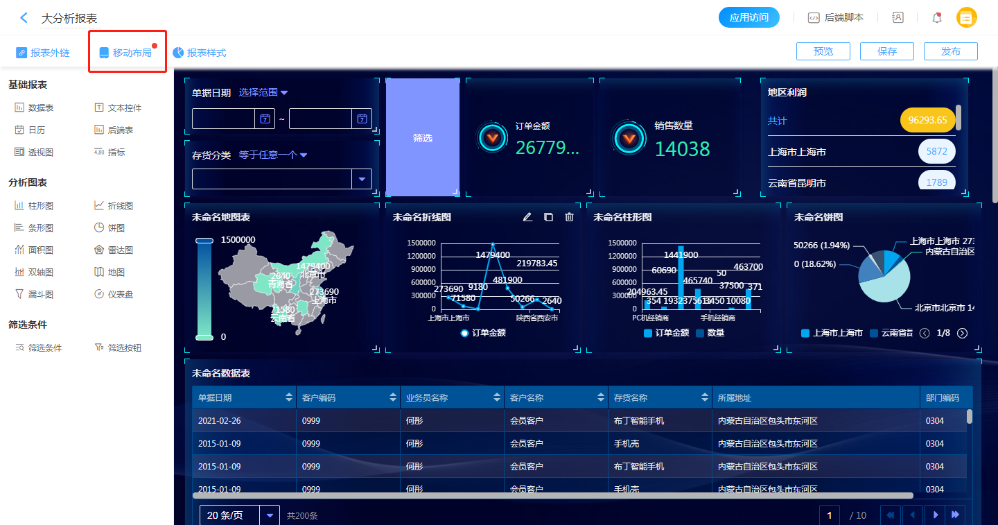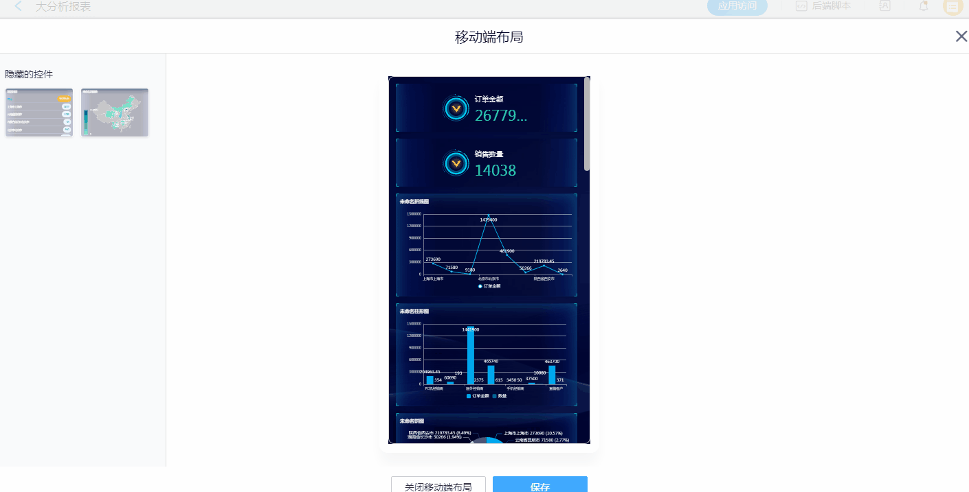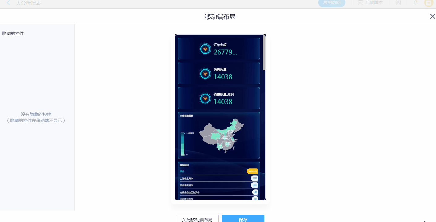 • 在移动布局中,可以自定义各个控件在移动端的展示位置、是否展示。用户可以根据需要,在此处优化报表移动端的排版。