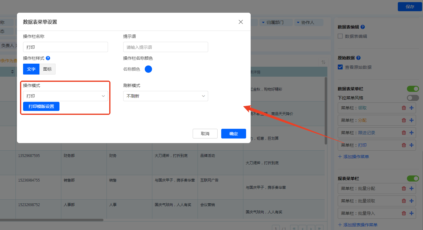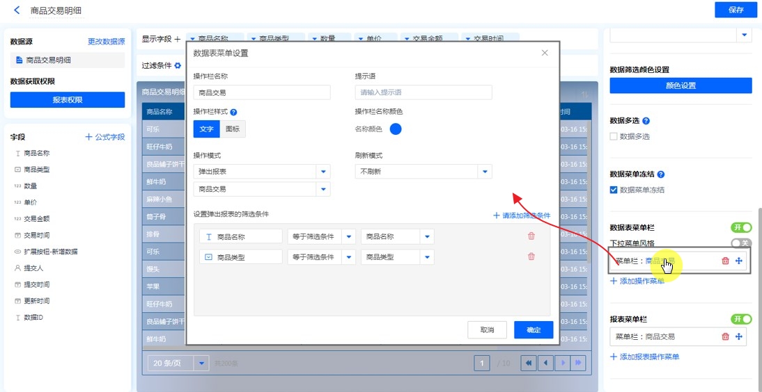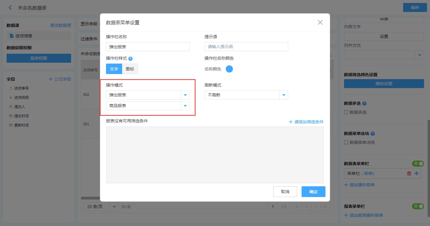 第一步:【目标报表的编辑页面】——【数据表菜单栏】——【添加操作菜单】,配置相关属性,操作模式选择【弹出表单】并选择表单,添加筛选条件,保存。