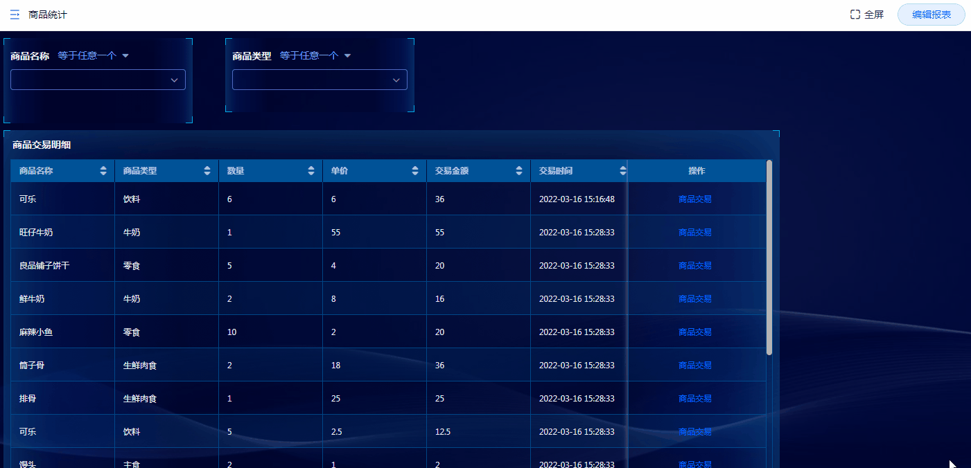 弹出报表可以用于查询数据,在单条数据的操作栏点击按钮即可弹出对应的报表,并可传入筛选条件进行查询数据。