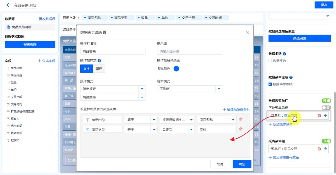 第一步:【目标报表的编辑页面】——【数据表菜单栏】——【添加操作菜单】,配置相关属性,操作模式选择【【弹出报表】并选择报表,添加筛选条件,保存。