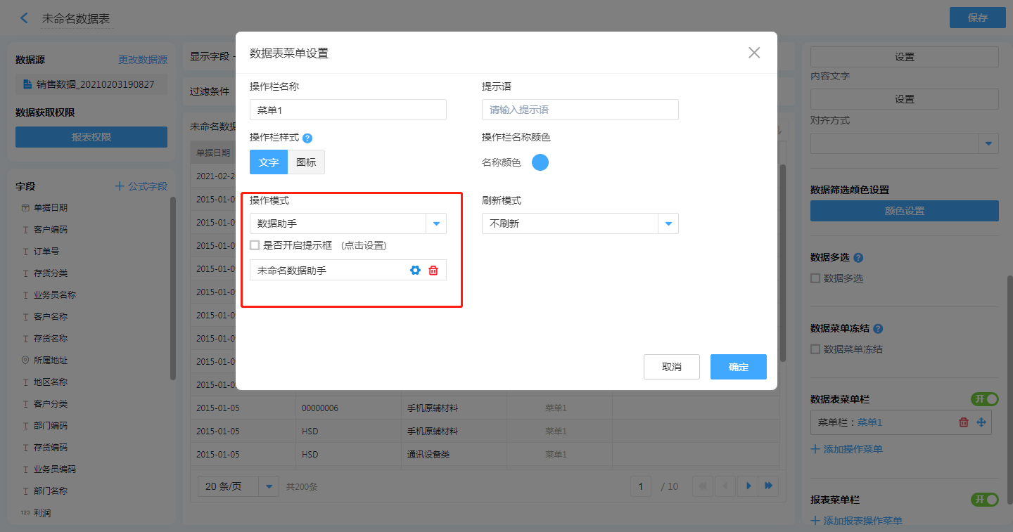 第一步:【目标报表的编辑页面】——【数据表菜单栏】——【添加操作菜单】,配置相关属性,操作模式选择【数据助手】。