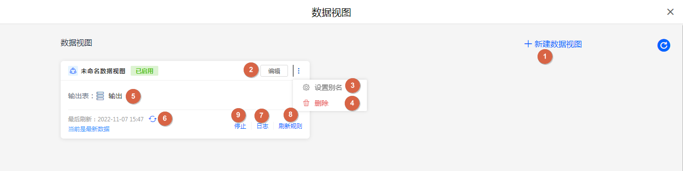 | ⑨ | 启用/停用 | 启用/停用数据视图; 停用的数据视图无法使用 |