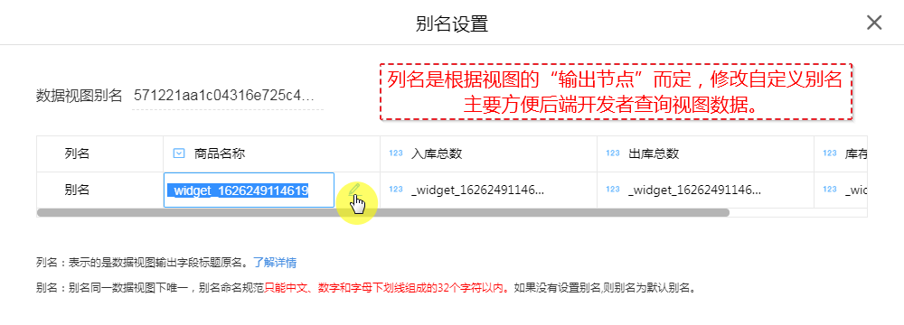 - 可修改自定义别名,别名主要作用是方便后端开发者根据别名查询视图数据。