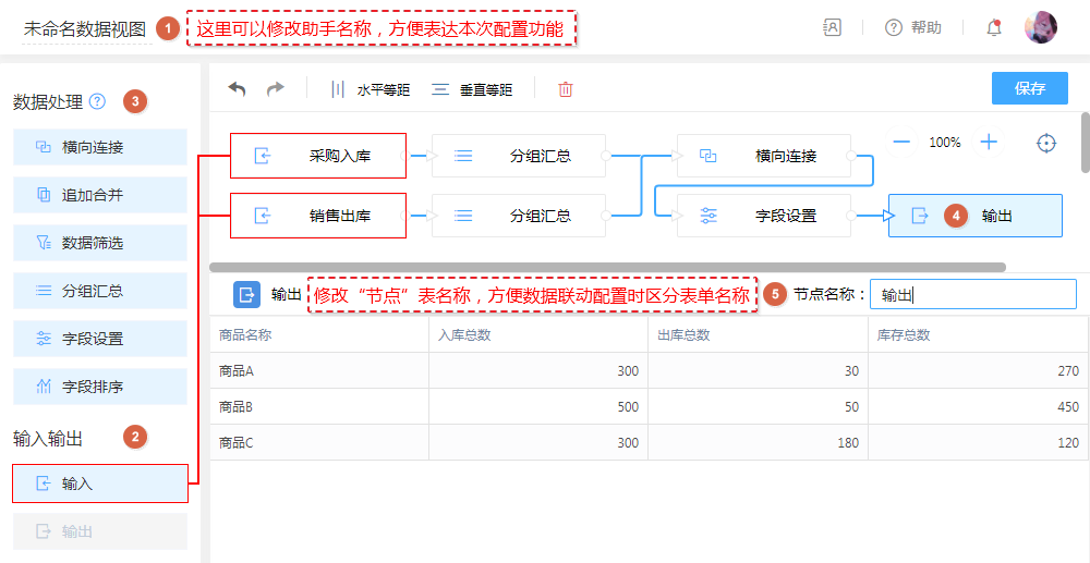 | ④ | 输出节点 | 可查看最终处理后的数据内容。 |