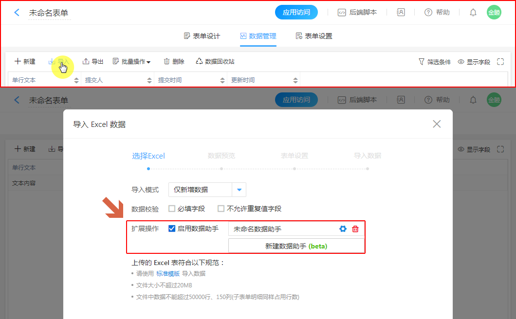 数据管理 - 导入 - 扩展操作:启用数据助手