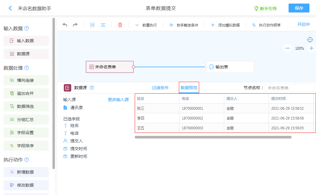 可以查看已添加的表单数据,方便后续节点配置预览效果。