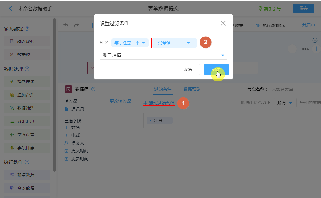 设置表单数据输入值为条件,筛选数据源。