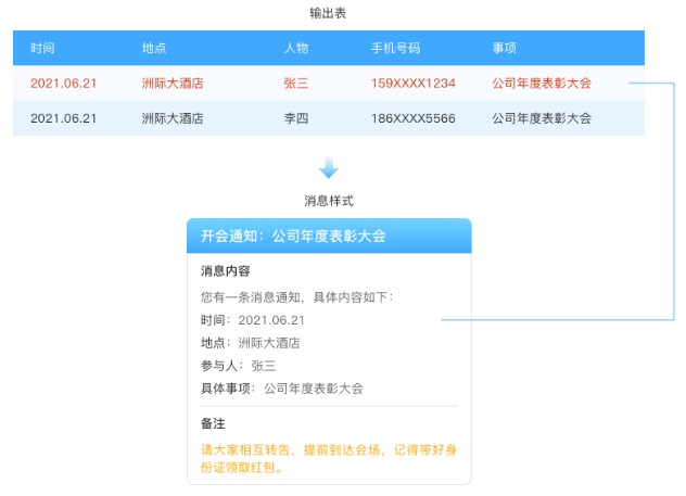 将输出表内的所有数据进行以短信/邮件/语音通知/微信提醒的方式发送给指定的成员或部门或手机号或邮箱。