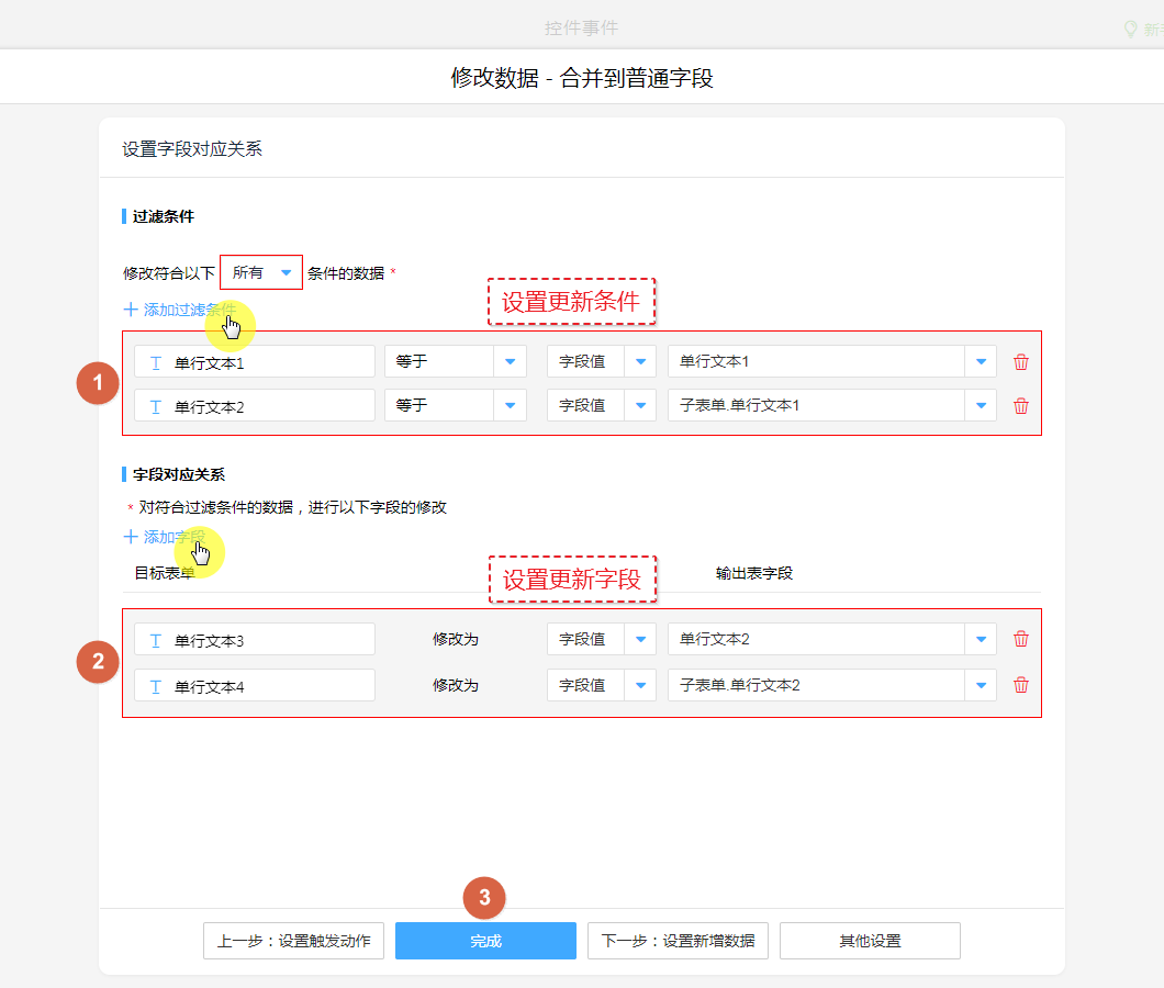 ③、设置子表单更新字段。