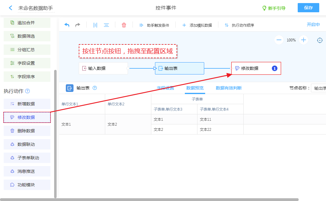 创建“修改数据”动作节点,将“输出表”的数据更新至其他表单。